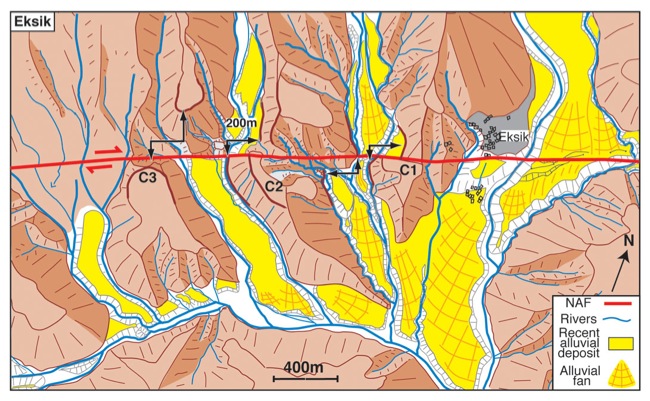 Morphology in the central part of the North Anatolian Fault deplaced by 200m and that started to form 10,000 to 12,000 years ago.