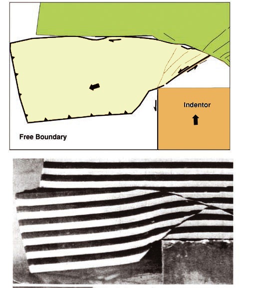 The Anatolian extrusion is similar to experiments in plasticine carried out by Peltzer et al. (C.r. Acad. Sci. Paris, 294, 1341-1348, 1982). The indentor is applied to a free boundary at the base and the system is free to move westward. As deformation evolves a left-lateral fault first appears in the east. It is then cross cut by a right lateral fault that propagates toward the free boundary in the west. The photograph is from the original experiment of Pelzer et al. (1982).