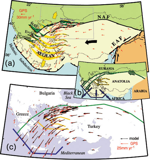 The Anatolian block (a) escapes to the east as a result of the collision between Eurasia and Arabia. The block is bounded to the north by the North Anatolian fault (NAF) and to the east by the East Anatolian fault (EAF), and to the south by the Hellenic subduction zone. Yellow feature indicate structure that have been active in the last 15 Myr. Structures shown in dark green have been re-activated by the NAF propagating into the region. Red arrows are GPS vectors (McClusky et al., JGR, 2000). In b the structures used to model GPS velocity field. In (c) the model reproducing the Anatolia/Eurasia kinematics.