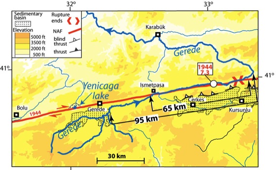 Right lateral offset of the Gerede river valley is 65 to 95 km.