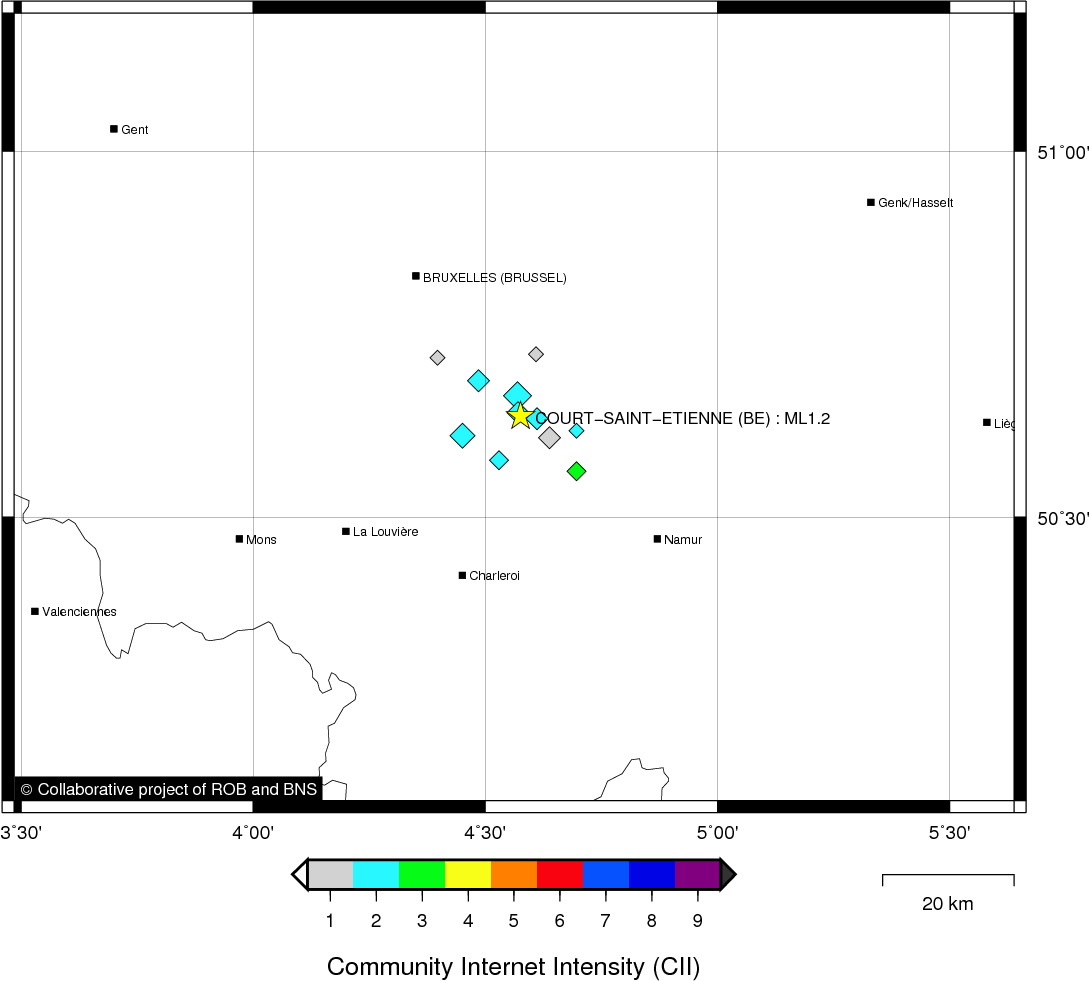 Metingen door het Duits seismometernetwerk van het aardbevingsstation Bensberg (Universiteit van Keulen, Duitsland)
