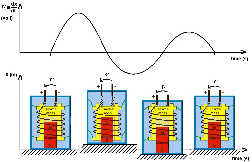 Bij de passage van een seismische golf zal de behuizing mee bewegen met de trillingen van de grond, terwijl de massa, door haar inertie en ophanging aan veren, de neiging zal hebben om stationair te blijven. We hebben dan te maken met een spoel waar omheen een magnetisch veld beweegt. De elektrische spanning die hierdoor wordt opgewekt aan de uiteinden van de spoel is evenredig is met de bewegingssnelheid van het magnetisch veld. Aangezien het magnetisch veld met de snelheid van de grond beweegt, verkrijgen we op deze manier een omzetter van grondsnelheid naar elektrische spanning (zie Fig. 2).